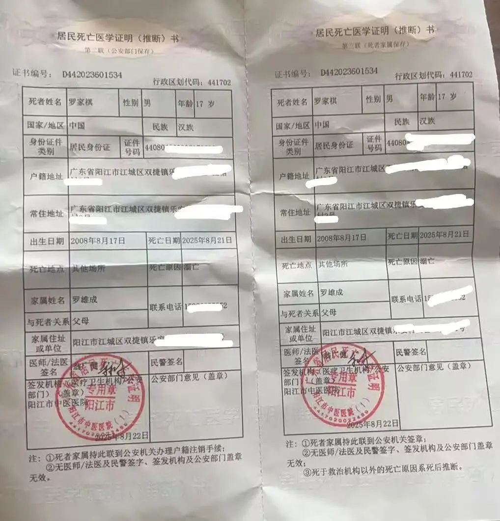 看着17岁小女儿罗家祺的身份证,8月25日,来自广东省阳江市江城区双捷镇的梁女士,眼泪止不住地流。原本,就在几天前,行将在本年9月读高三的罗家祺在勇救又名落水的婆婆时糟糕溺一火,他的人命经久定格在阿谁傍晚。
